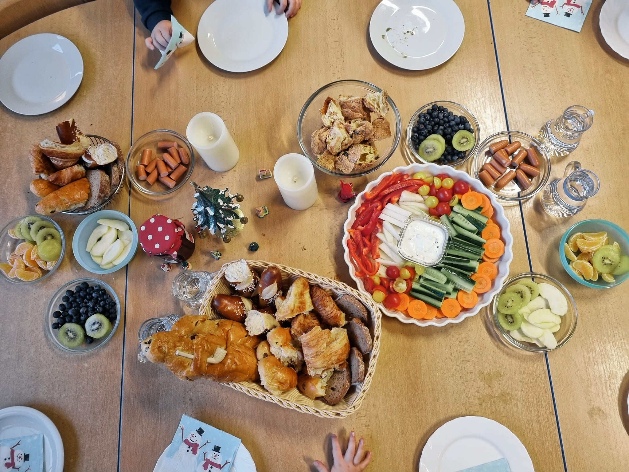 A relaxed atmosphere is very important to us at mealtimes, so that the children feel comfortable and can associate eating with joie de vivre. We like to start the meals with a ritual such as a song or a finger play. During the meal, the pedagogical staff encourage table conversations with and between the children and encourage them to try new things.