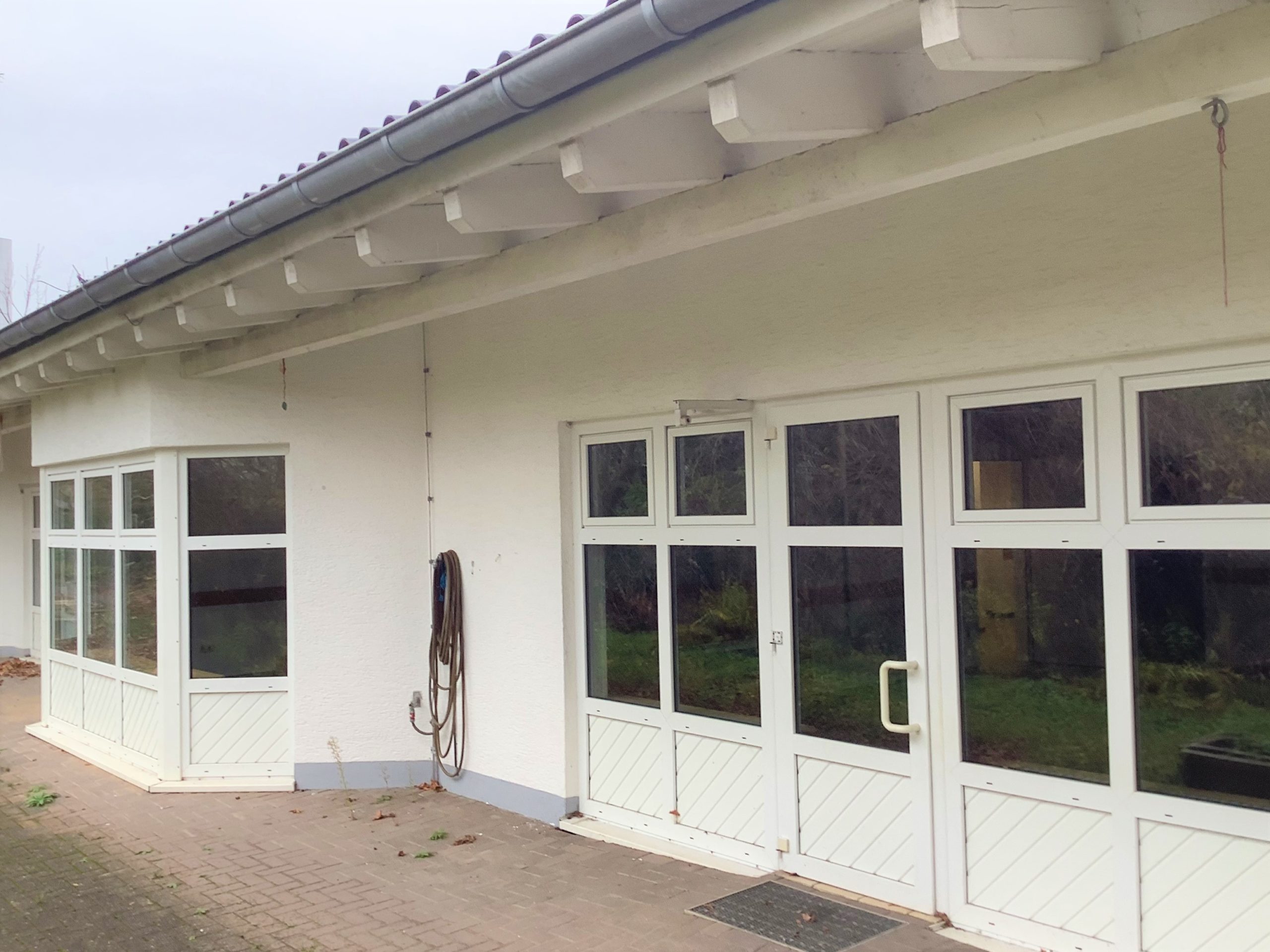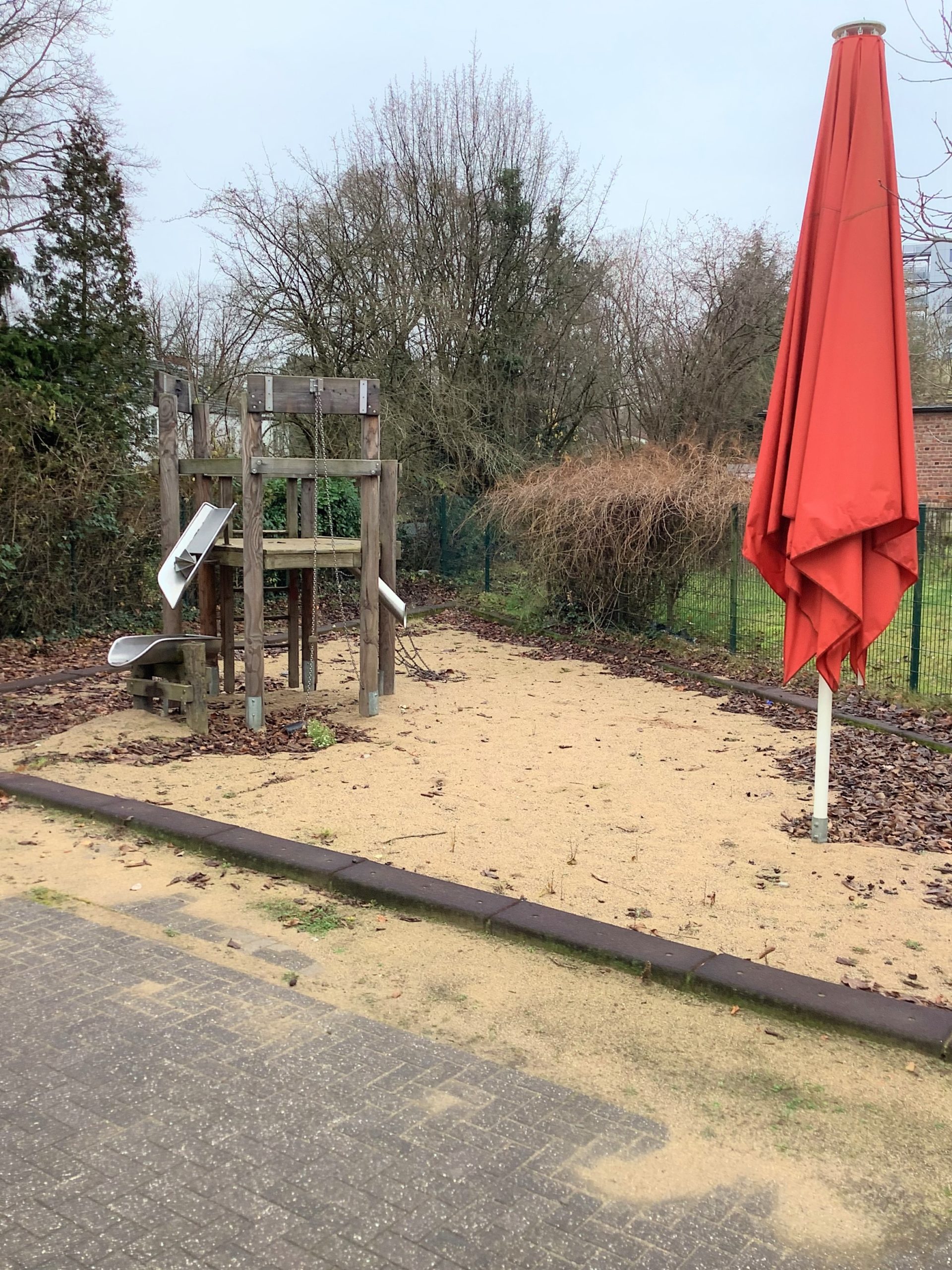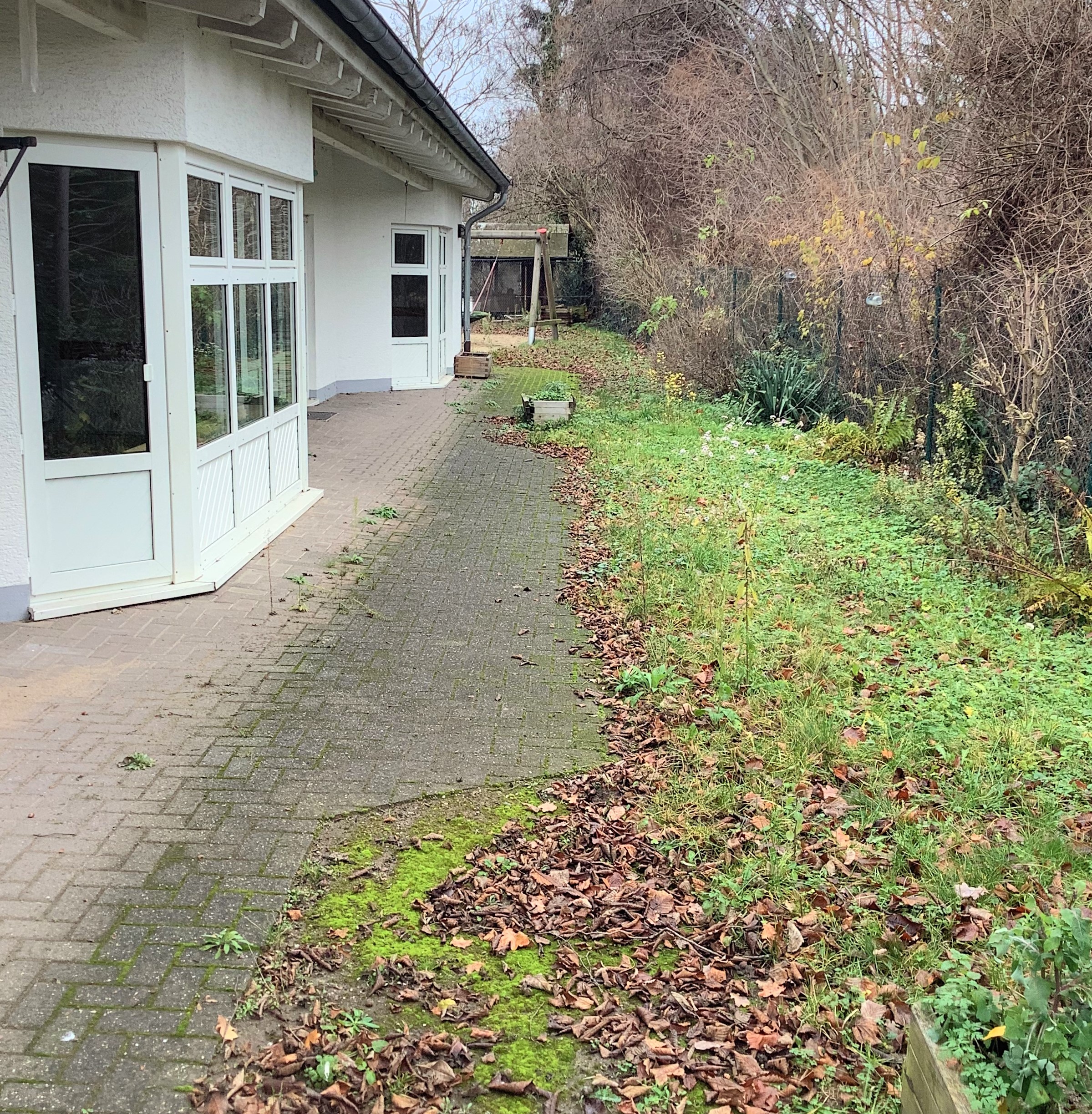 The outdoor area currently looks a bit too adventurous. It will be transformed back into a child-friendly play area by our garden and landscaping contractor, where new playground equipment will find space and the children can romp, dig and climb.